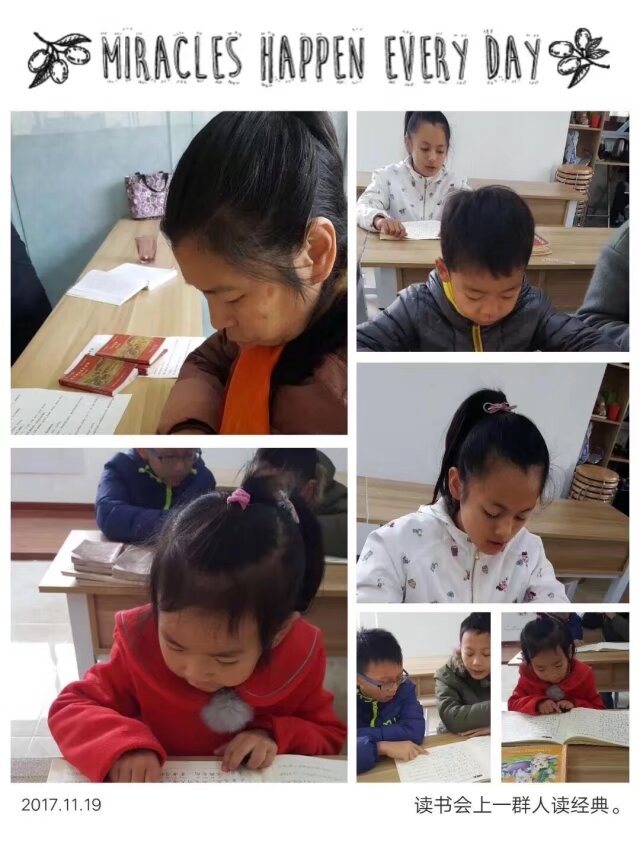 每周日读书会,孩子们在玩中学,学中玩,学会了关心,学会了帮助,学会了鼓励!每天半小时的诵读经典,聆听到了圣贤的教诲,在学中悟,为自己成长中提升了的人格品味。